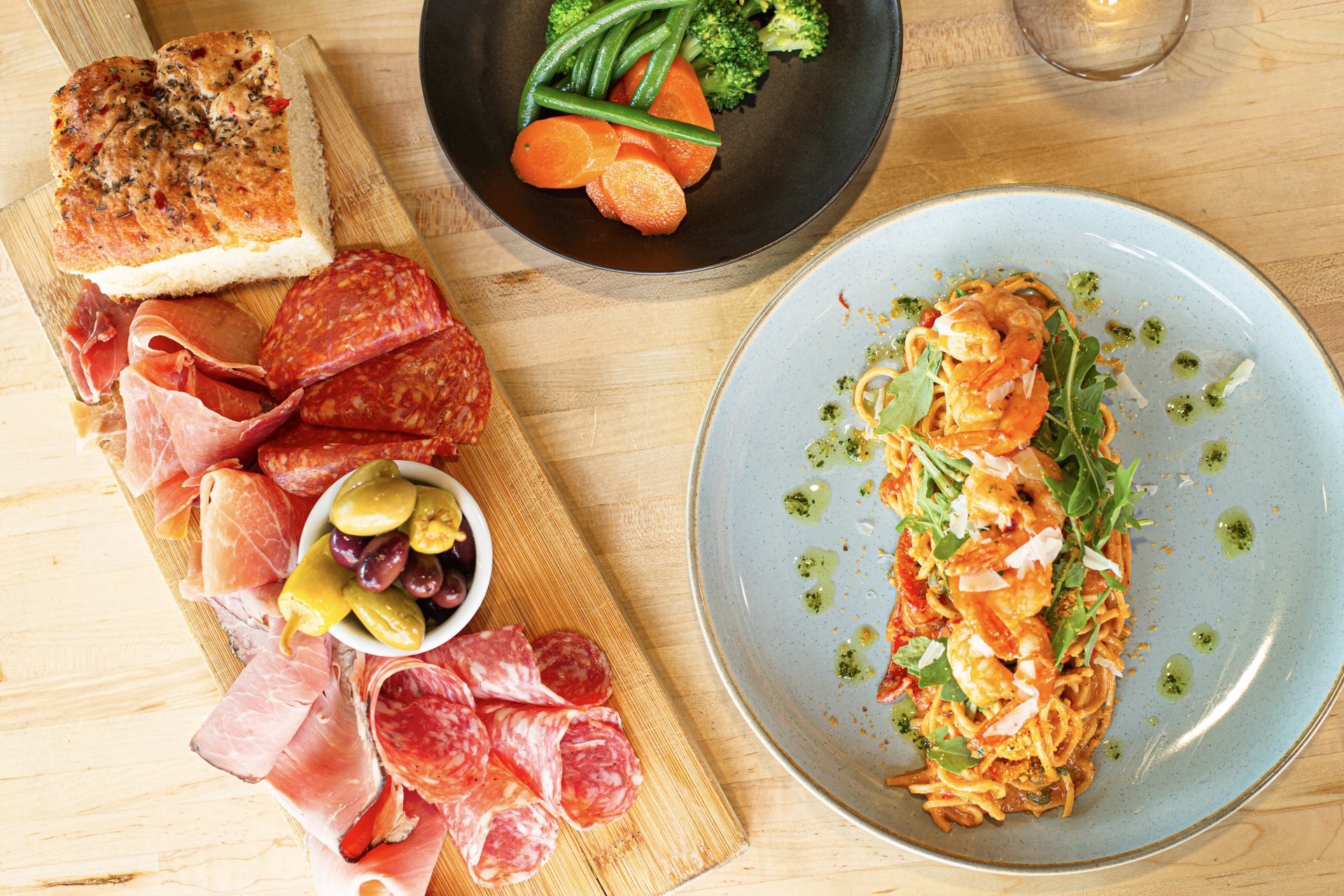Focaccia bread, herb butter, chili Pecorino, marinated olives, and tart pickled peppers