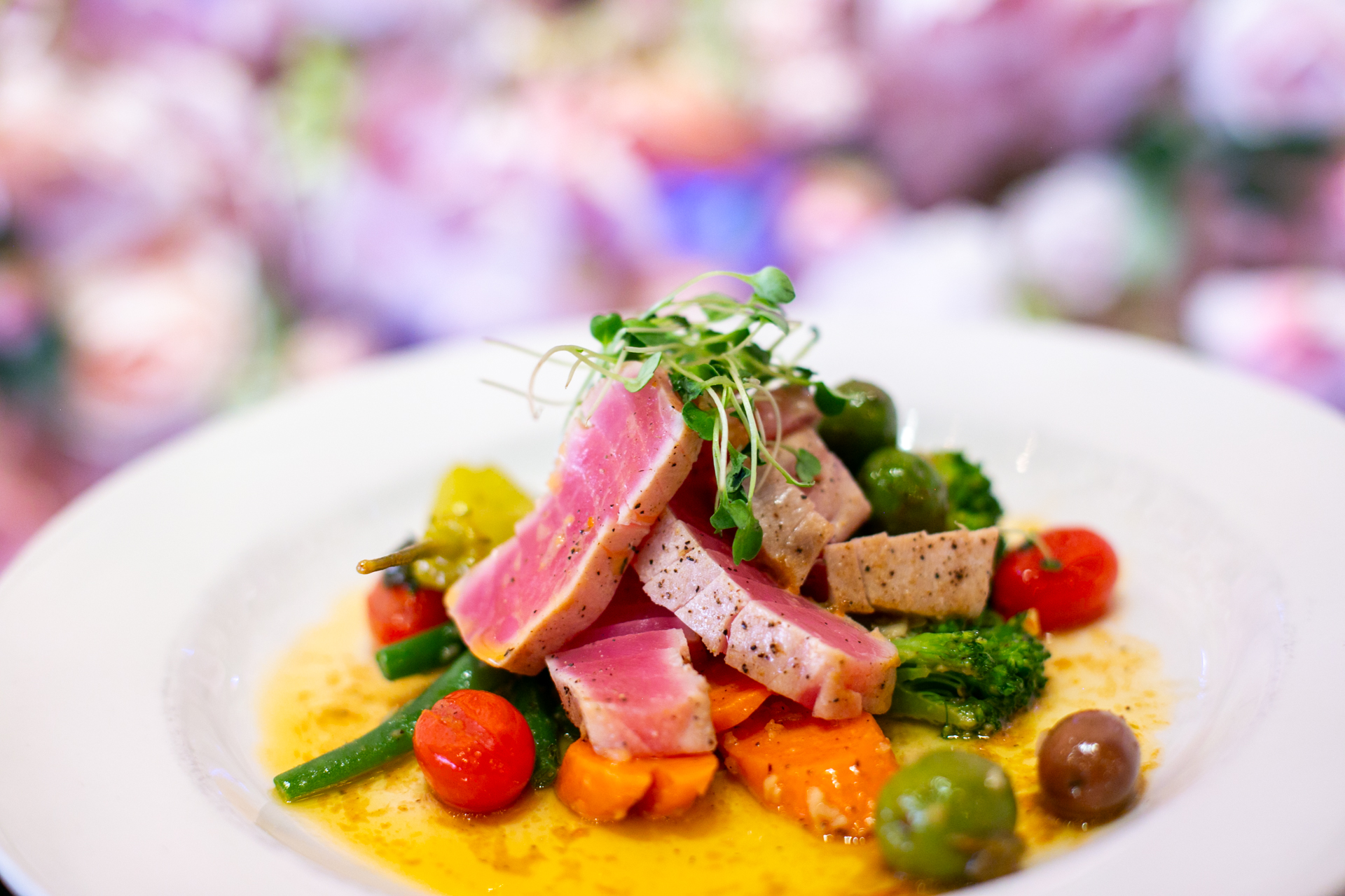 Seared rare Yellowfin Tuna, Capers, Roasted Tomato, Tomato-Lime Sauce with Seasonal Vegetables, and Olives